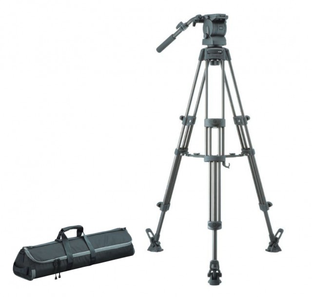 Compact tripod system with RH35D Compact Dual-Function Fluid Head, RT30B 2-Stage Aluminum Tripod, Ground Spreader, and Carrying Case. Weight 6 kg, 9 kg Payload, 56 to 166 cm Height Range.