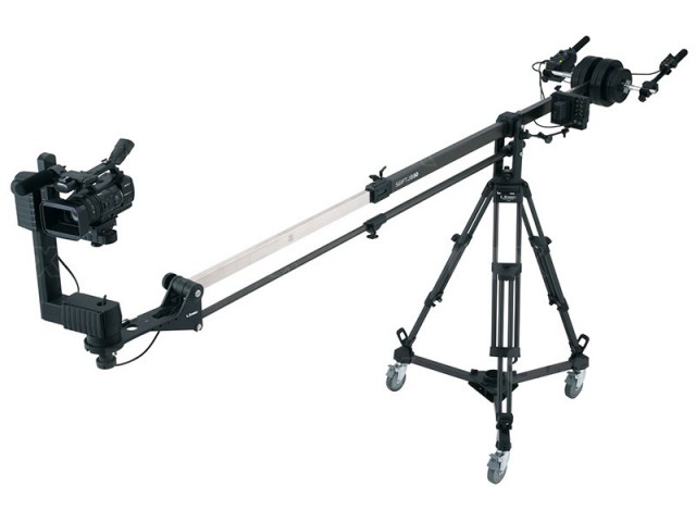 Complete assembly of camera arm, tripod legs, wheeled base and motorized head with controls.