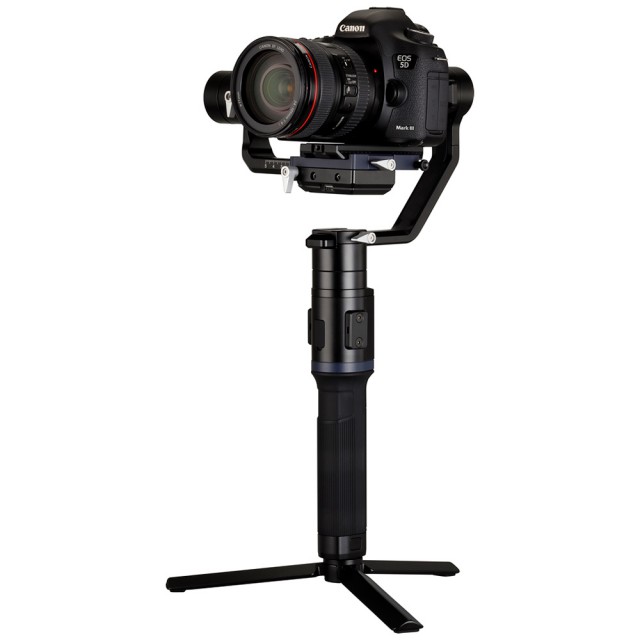 Designed with a long battery life of 18 hours, users can enjoy many hours of recording comfortably without having to worry about losing power, even when shooting at a location without a power supply such as the outdoors, fields or events. Maximum working time for setups with a 0.5kg payload: 18 hours. Maximum working time for setups with a 3.6kg payload: 12 hours. Under the gimbal's grip, there is a 1/4" screw hole and a 3/8" screw hole for attachments, not only for the standard mini tripods, but also for other types of monopods or tripods. When folded, the standard mini tripod becomes an extended grip with a easy to hold design. When opened, the standard mini tripod provides great stability. The sliding plate is compatible with Libec, Manfrotto and Sachtler heads, allowing users to quickly swap between camera supports onsite without the need to change sliding plates.