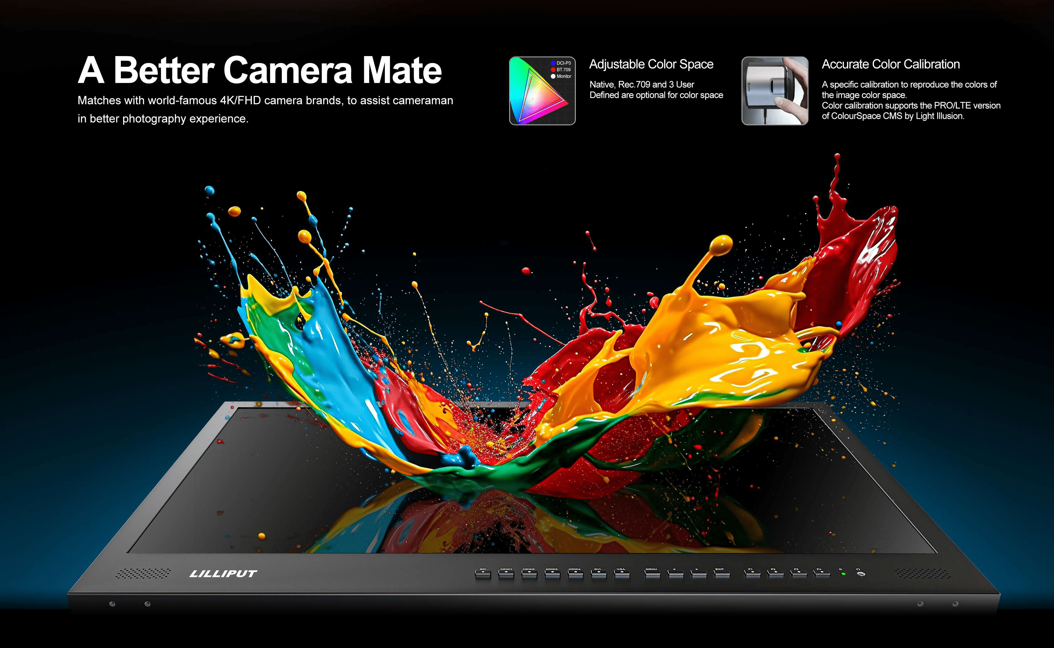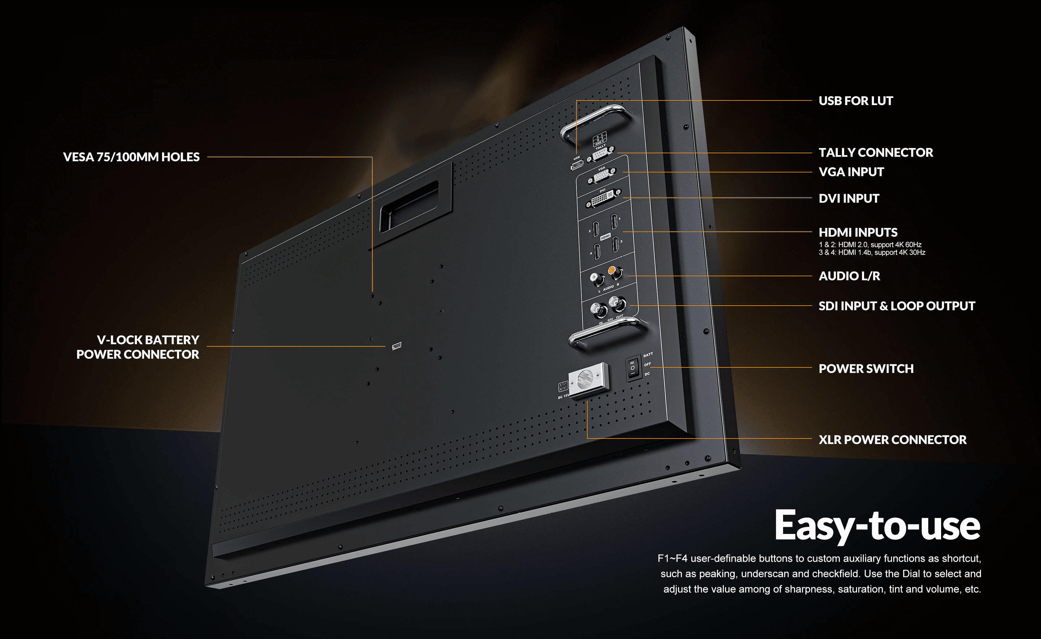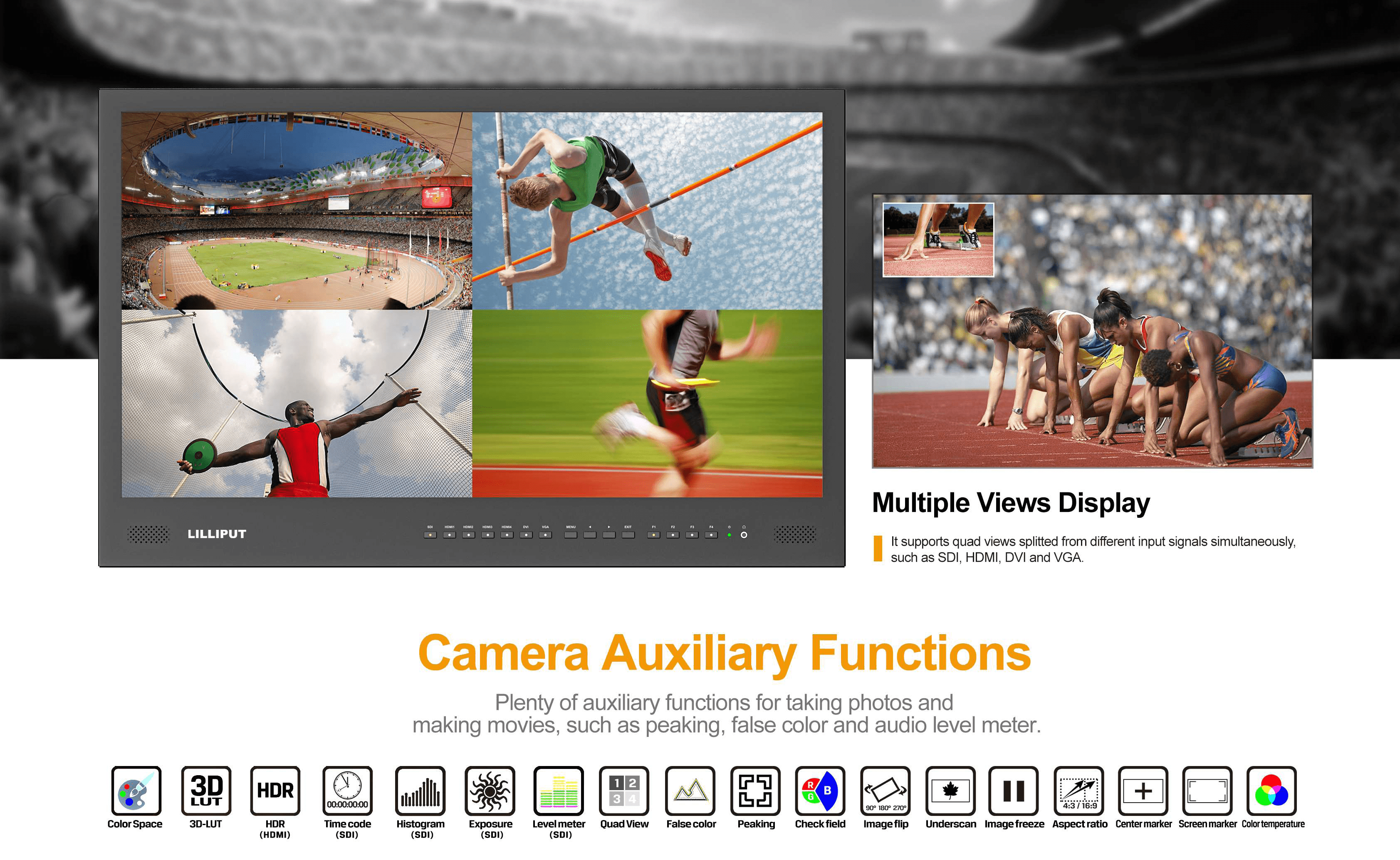Its headline feature is a 3840×2160 Ultra-HD native resolution screen, offering fine picture quality and accurate color representation. Inputs support both 3G-SDI and 4× 4K HDMI signals, and it also supports Quad View from different input signals simultaneously, which provides an efficient solution for multi-camera monitoring.