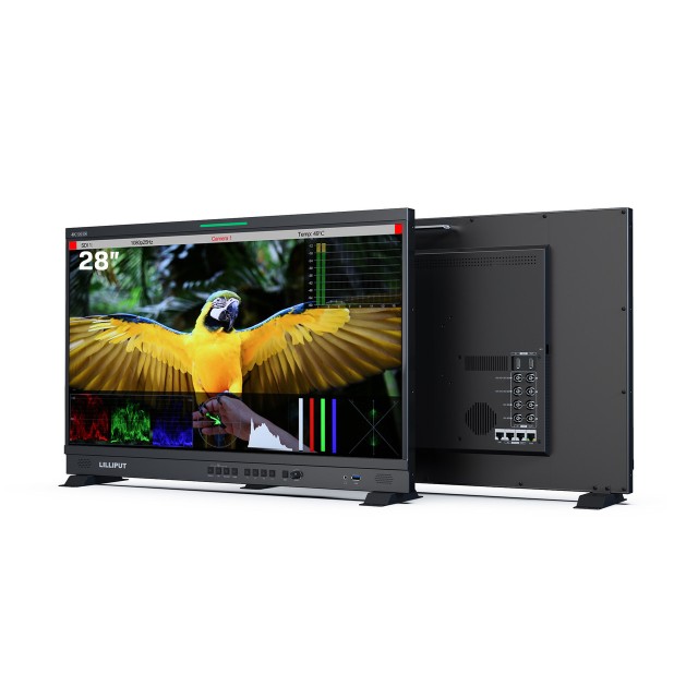 Q28 28" 12G-SDI Professional Production Studio Monitor from Lilliput is a professional studio display with a 3840 x 2160 screen resolution that can also receive up to DCI 4K60 signals, which will play as letterboxed content within the appropriate aspect ratio. There are four 12G-SDI inputs, one HDMI input with respective loop outputs, and a 12G-SFP port for optional fiber-optic connectivity, all supporting 4K and embedded multichannel digital audio.
