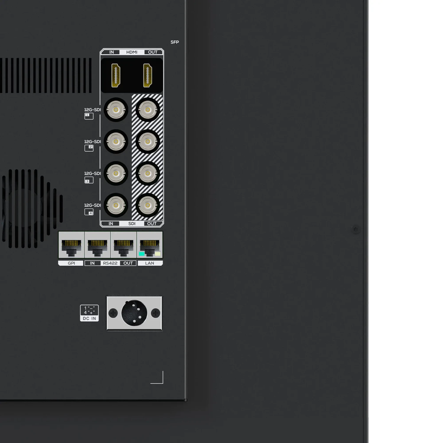 The Lilliput Q43-8K is a professional 43-inch 4K reference monitor built for high-end studio, broadcast, and live-production environments. Its 3840×2160 10-bit IPS panel delivers 400 cd/m² brightness, 1200:1 contrast, 178° viewing angles, and full HDR support (HLG + PQ ST2084 300/1000/10000) with all major log formats (SLog2/3, CLog, NLog, ArriLog, JLog). 8K-ready connectivity: 4× 12G-SDI (Quad-Link 8K60), optional 12G-SFP+ fiber, and HDMI 2.0 (4K60) with full loop-through. Quad-Split Multiview lets you display four independent sources simultaneously—each with its own 3D-LUT, audio meters, and colorful border for instant identification. Advanced tools include waveform, vectorscope, histogram, false color, zebra, focus peaking, audio phase meter, and user 3D-LUT import (.cube via USB). Remote control via RS422 in/out, GPI, or LAN (web GUI + PC software) enables daisy-chaining and centralized control of multiple units. Housed in a sleek aluminum chassis with VESA 400×400 mount, it runs on 24 V DC (≤77 W) and weighs 14.5 kg. Perfect for colorists, directors, and live-switcher operators working with ARRI Alexa, RED V-Raptor, Sony Venice 8K, or Blackmagic URSA 12K.