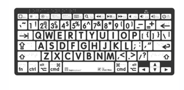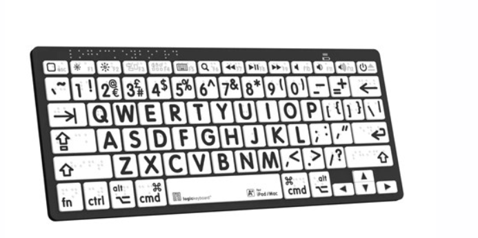 The Logickeyboard Braille/Large Print Black on White Mac Assistive Keyboard is a compact, wireless keyboard designed for accessibility. Featuring large-print keys combined with molded Braille characters, Bluetooth connectivity, and a lightweight design, it provides an inclusive and user-friendly typing experience for macOS and iPadOS users.
