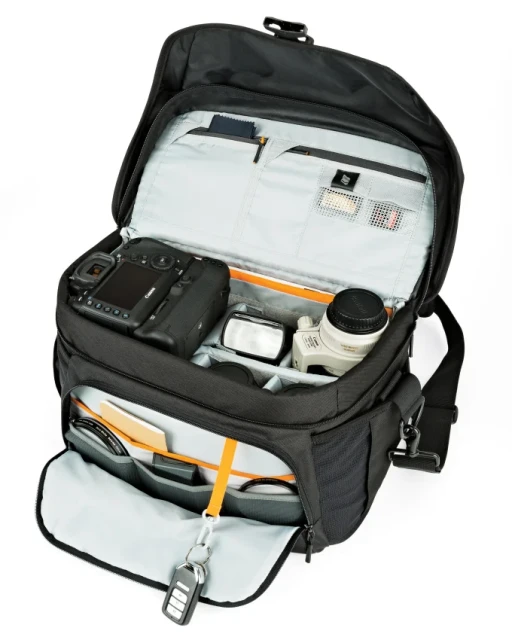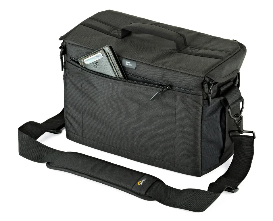 Pro nošení brašny je Lowepro Nova 200 vybavena odnímatelným ramenním popruhem pro pohodlné použití při fotografování a horním madlem pro přenášení v ruce.