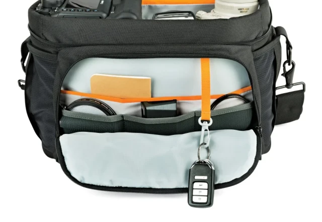 Přední oddíl má tři vnitřní kapsy ideální pro filtry nebo krytky objektivů, stejně jako prostor pro manuál nebo malou knihu. Na přední straně víka je další kapsa na zip, kterou lze použít pro každodenní předměty, jako je telefon, peněženka nebo klíče.