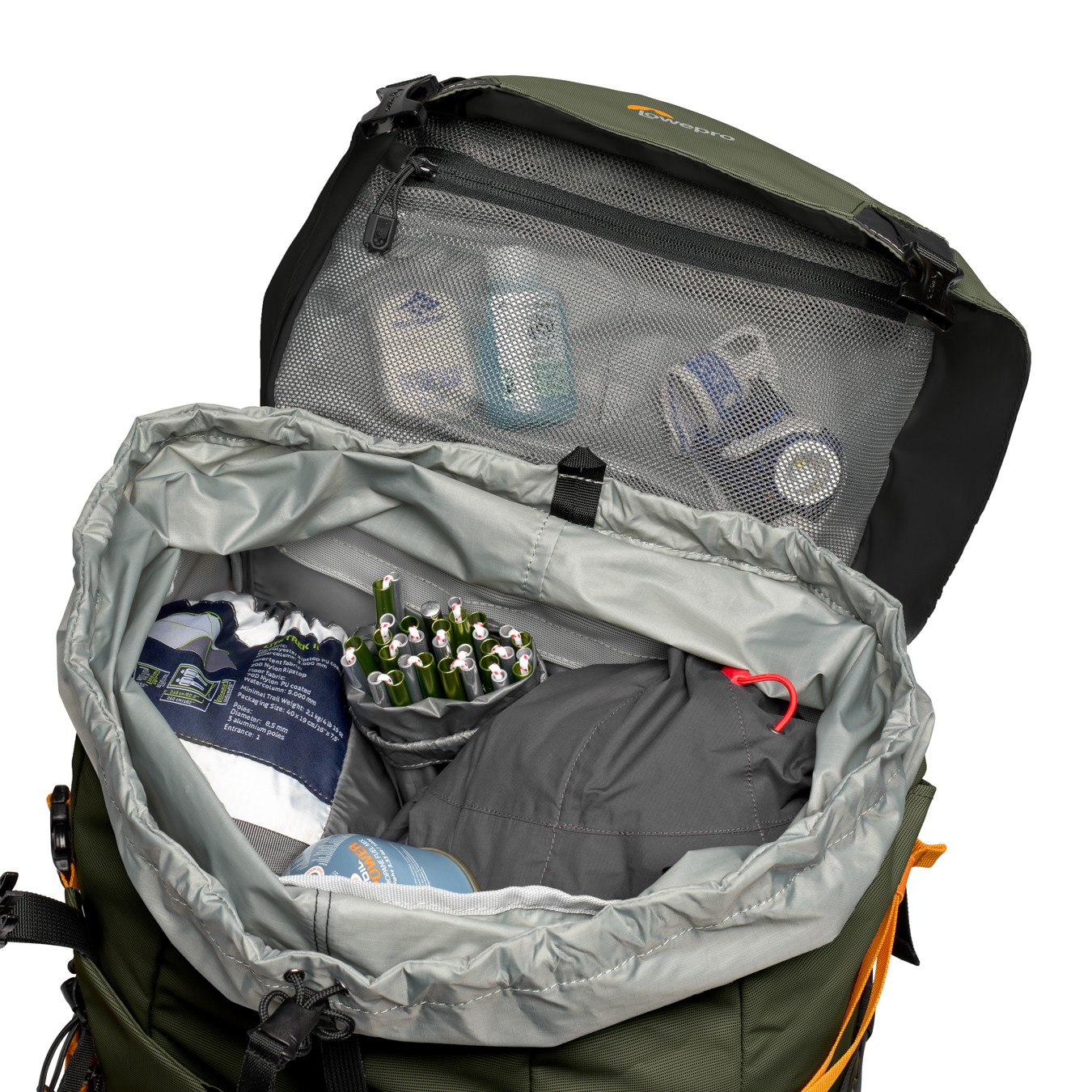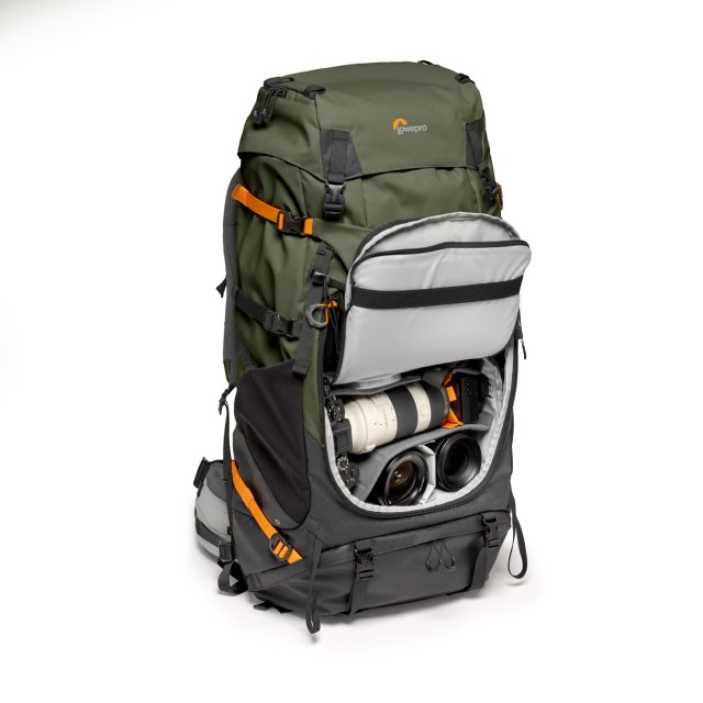 The backpack features a removable GearUp PRO XL camera insert with dedicated accessory strap system for multiple carrying configurations. Front and back access points allow for convenient gear retrieval in the field. The ActivLift™ harness system with torso-length adjustment ensures optimal weight distribution and comfort, even on long multi-day hikes. A dedicated 3-litre hydration pocket keeps you hydrated, while the spacious 70 L main compartment provides storage for sleeping bags, tents, jackets, and other backcountry essentials.