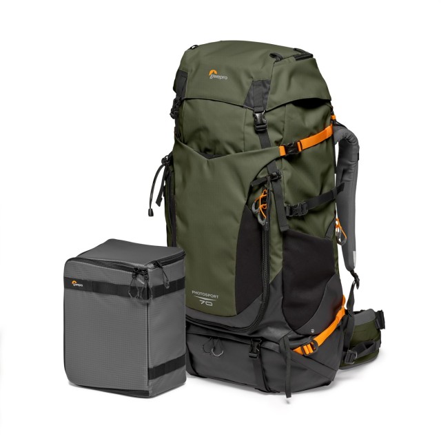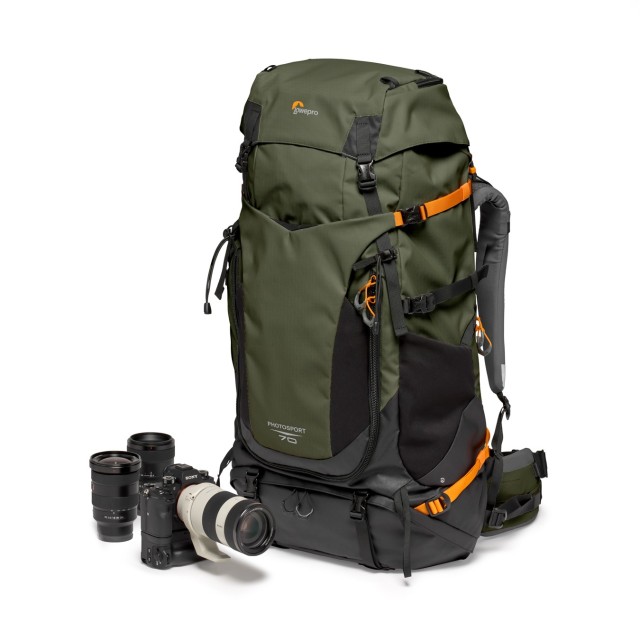 The Lowepro PhotoSport PRO 70L AW IV (S-M) is a rugged, lightweight backcountry camera backpack designed for professional photographers on multi-day hikes. It fits a pro DSLR or mirrorless camera with 70-200mm f/2.8 lens, 1–2 extra lenses, and a tripod, with a removable GearUp PRO XL insert, hydration pocket, and ActivLift™ harness for all-day comfort.
