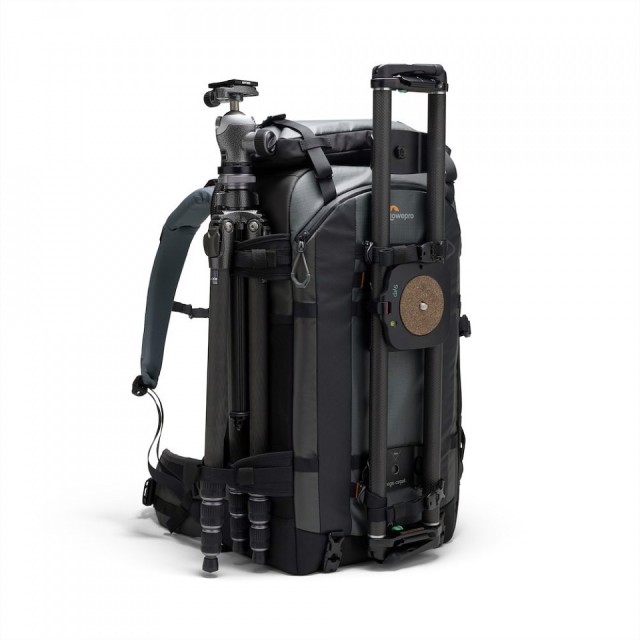 Cross-functionality and individual configuration are possible thanks to a system of loops, a pair of included accessory straps, and a retractable tripod holder with a zippered cover in the front pocket. If you need to carry two tripods or prefer side mounting, there are special tripod straps on the side of the backpack. The front and side sections are designed to accommodate a wide range of tripods, including models up to the size of the Gitzo Systematic.