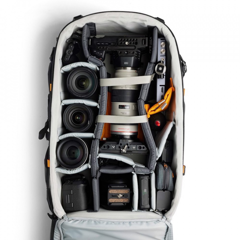 The main cameracompartment is accessible from the rear and is designed to provide maximum space and layout flexibility. It can accommodate an 800 mm f/5.6 lens on a DSLR with a portrait grip or a CN20 lens on a RED body for nature filmmakers, as well as a professional drone setup.