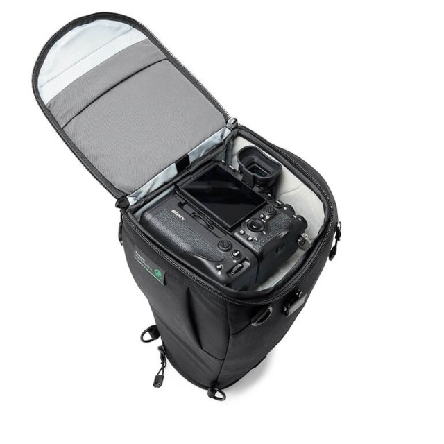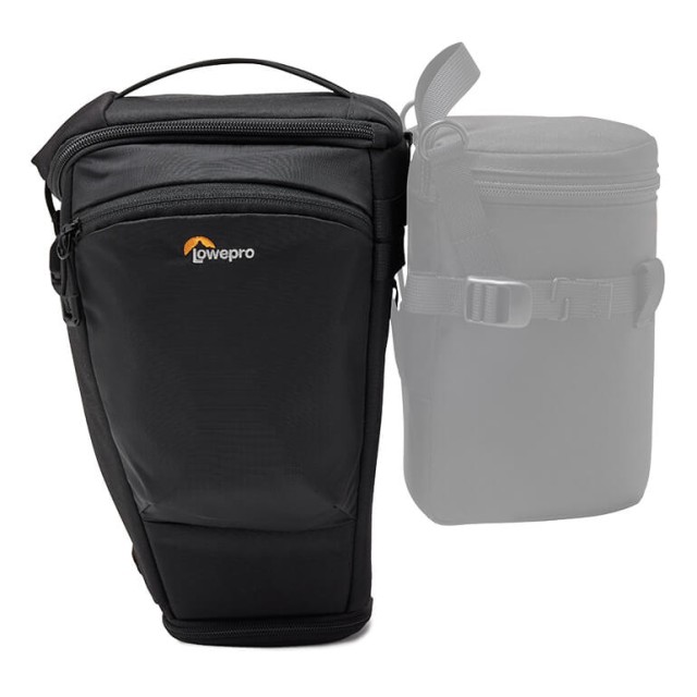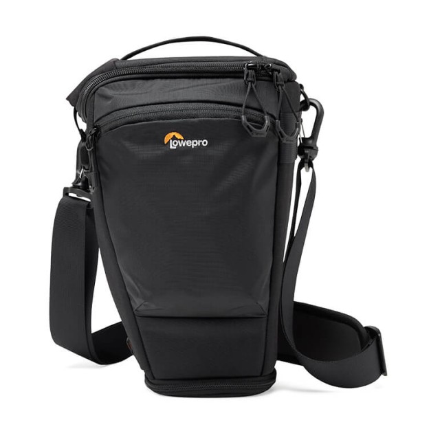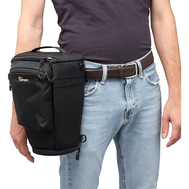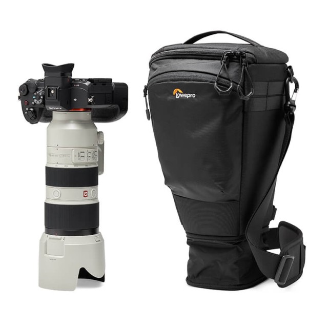 TopLoader fits full frame body w/grip & lens up to 70-200mm F2.8, with expansion for lens hood. Compatible with SlipLock accessories like lens cases