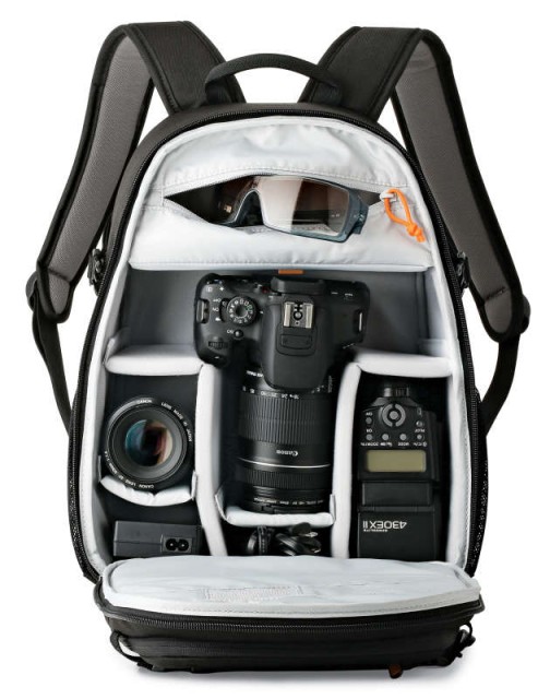The spacious main compartment with double zipper contains two large and two small padded adjustable dividers that protect your camera, 2 lenses, flash, and other accessories, while the inner zippered pocket separates cables and spare batteries.