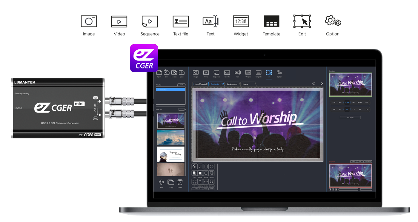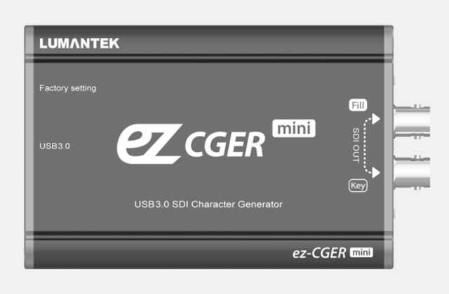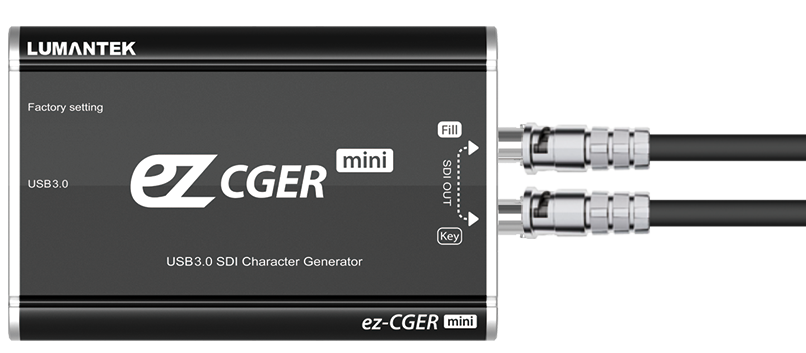 With its mini converter size and simple USB 3.0 connection, ez-CGER mini generates Fill & Key in SDI format. Connect these to your own video switcher to live broadcast your video with CG! Insert images, videos, text files and more with LUMANTEK's dedicated software ez-CGER.
