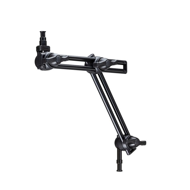 The Manfrotto 396B-2 2-Section Double Articulated Arm is a 640 g black aluminum arm with extendable sliding section (up to 62.5 cm), 5 kg payload, quick-lock system, camera bracket with 3/8" female + 5/8" stud top, and anti-rotation 16 mm hex/universal bottom spigot—delivering robust, versatile positioning for lights, cameras, or monitors in studio…