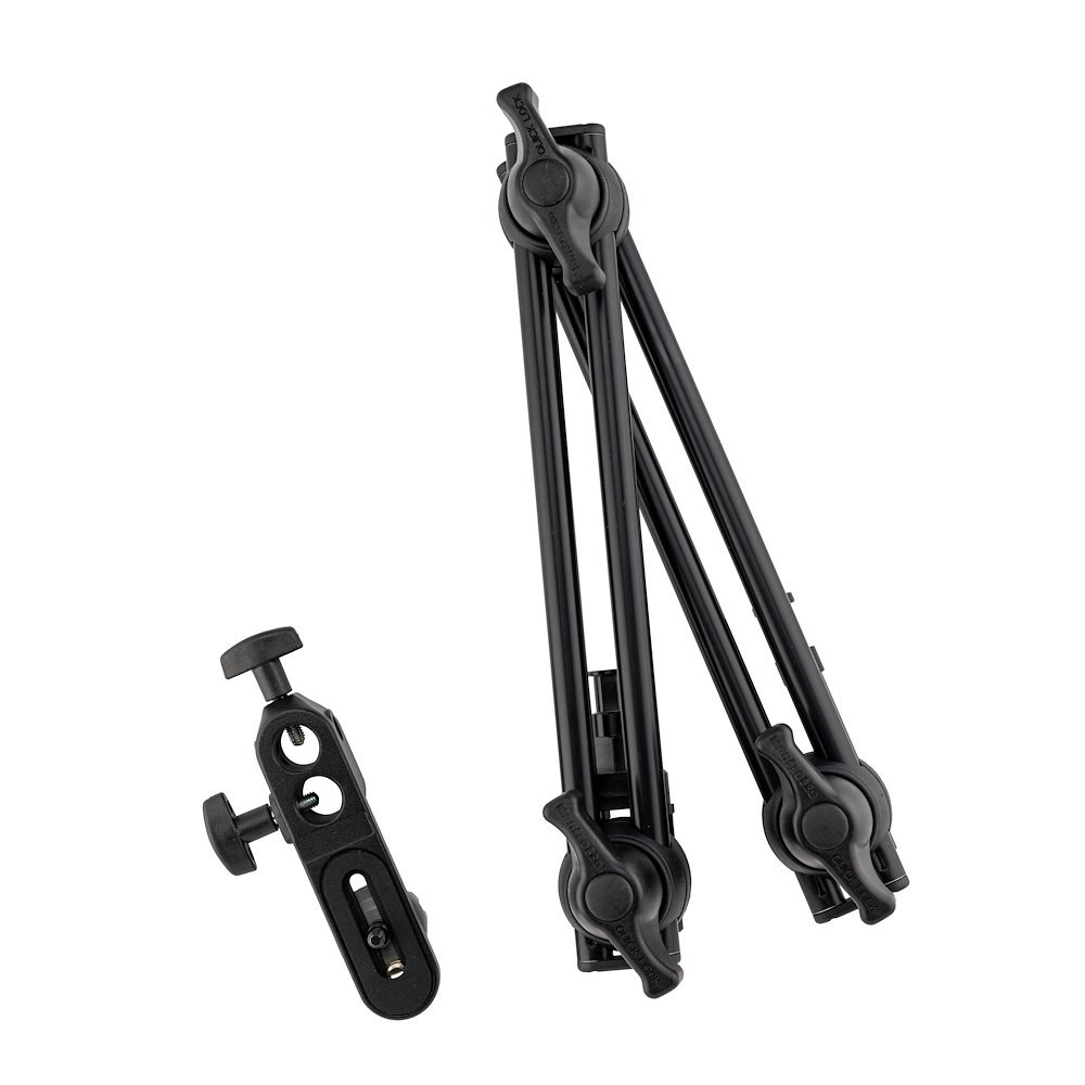 The Manfrotto 396B-2 features two articulated sections with a sliding extension that locks instantly via ergonomic quick-release levers, reaching 62.5 cm for precise overhead, side, or low-angle setups. The top camera bracket includes a 3/8"-16 female thread and 16 mm baby stud, while the bottom spigot combines a hexagonal anti-rotation profile (Super Clamp compatible) with a universal 16 mm round section for stands or clamps. Rated for 5 kg, the black anodized aluminum frame resists flex and wear, making it ideal for product photography, video monitoring, or gaffer work with LED panels, speedlights, or small cameras—compact, strong, and endlessly adjustable.