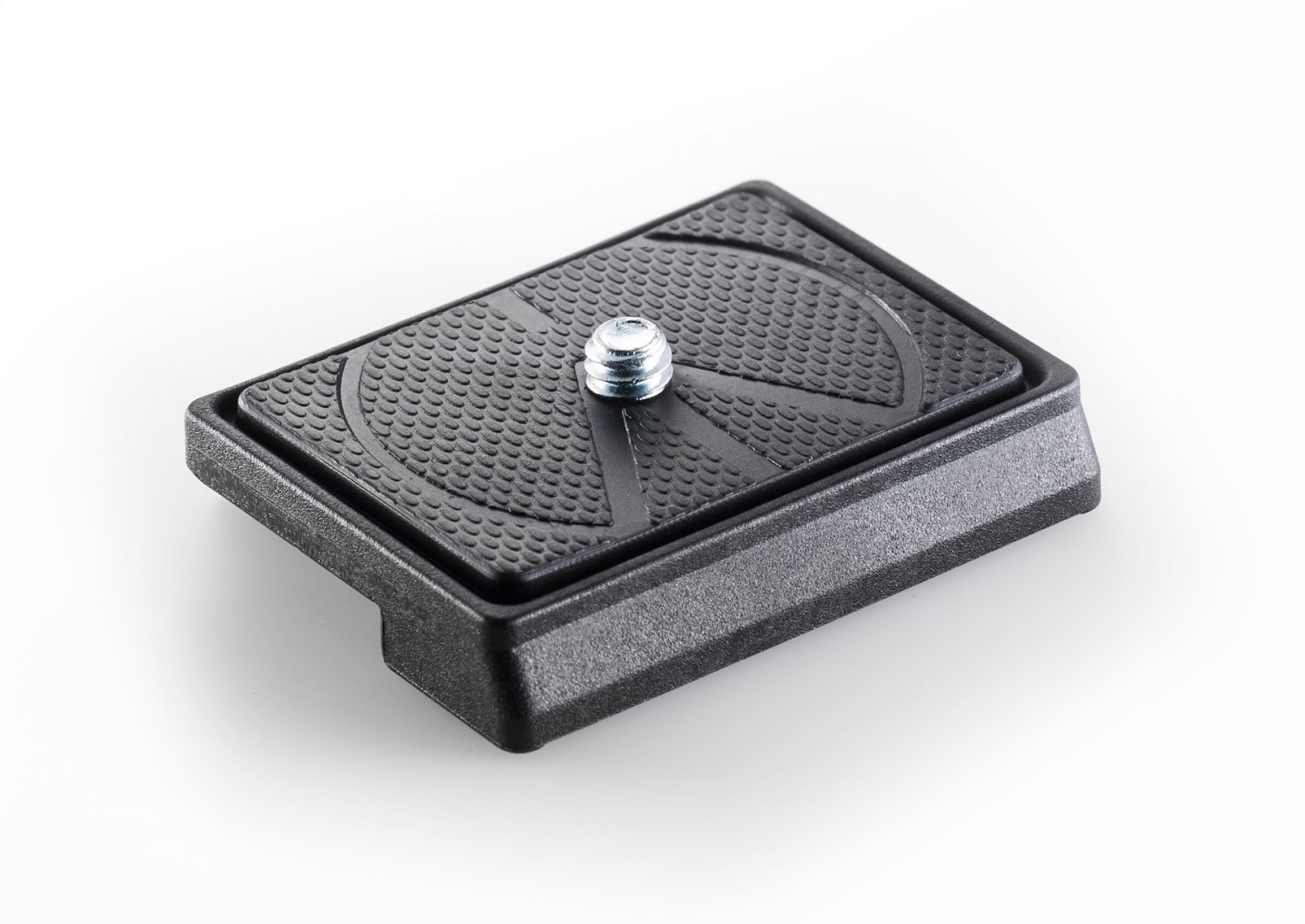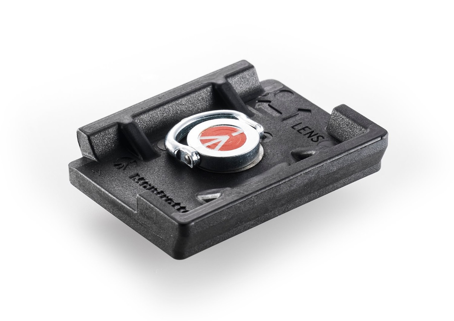 Manfrotto 200LT-PL Light Quick Release Plate: Ultra-light 31g technopolymer/glass-fiber plate with RC2/Q2 compatibility, 4kg load capacity, high-grip rubber, and logo-shaped flip-lock for fast, secure camera attachment.