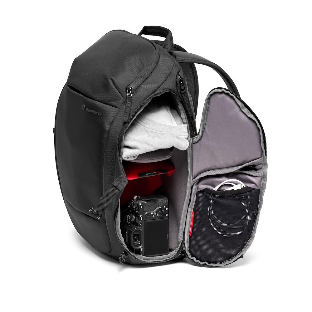 The Manfrotto Advanced Travel Backpack III is an essential compact and easily portable camera and laptop backpack for your travels. This original backpack is designed for DSLRs or mirrorless cameras and is designed to store and carry your photography equipment and media accessories. With a top and bottom section accessible from one side of the backpack and an expandable side pocket, you can customize this backpack to suit your needs. It can hold a DSLR camera such as the Canon EOS 5D Mark IV, with an additional 3-4 lenses depending on their size (for example, 16-35/2.8, 24-70/2.8, or 70-200/2.8). Alternatively, it can hold a mirrorless camera such as a Sony Alpha with a 70-200 mm f/4 lens, plus a DJI Mavic Pro 2 with several batteries and a remote control. The padded camera compartment features the all-new Manfrotto M-Guard™ Protection System. This system is made of special high-density EVA foam that provides exceptional shock absorption in a very thin profile. Customizable folding patterns allow for maximum versatility for full protection of your photography equipment while maximizing space. If you need more space, the expandable padded side pocket provides additional space for a travel tripod or handheld stabilizer such as the DJI Osmo Mobile 2. The backpack also features a smart front external connection for a tripod. Convenient side access points keep your gear within easy reach so you never miss that important shot, and the top compartment is ideal for your accessories and personal items. This design means you'll never have to search for what you need again. Other features include a dedicated 15" laptop pocket that is padded for extra protection and easily accessible on the go. This backpack can also be easily converted into a daypack by simply removing the dividers. All exterior fabrics are treated to make the backpack water-repellent, and it can be further reinforced with the included rain cover in case of inclement weather.
