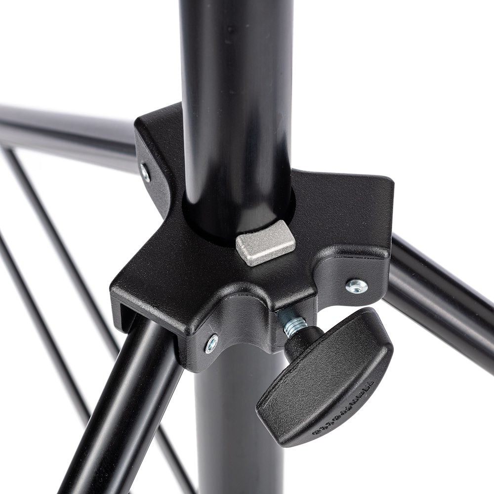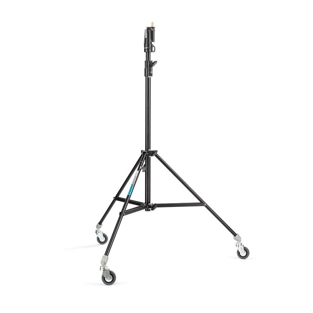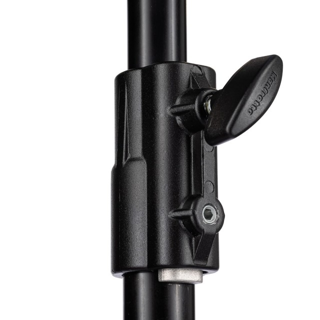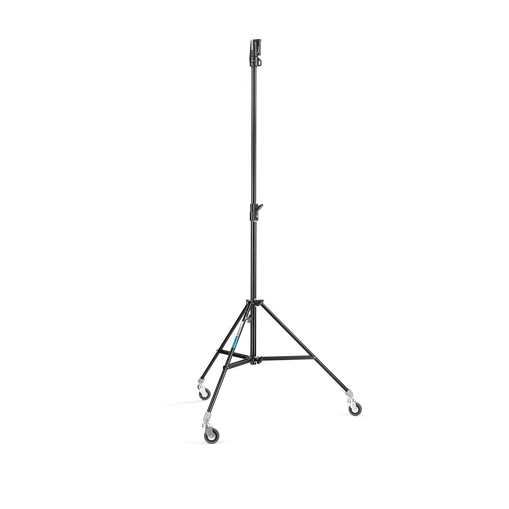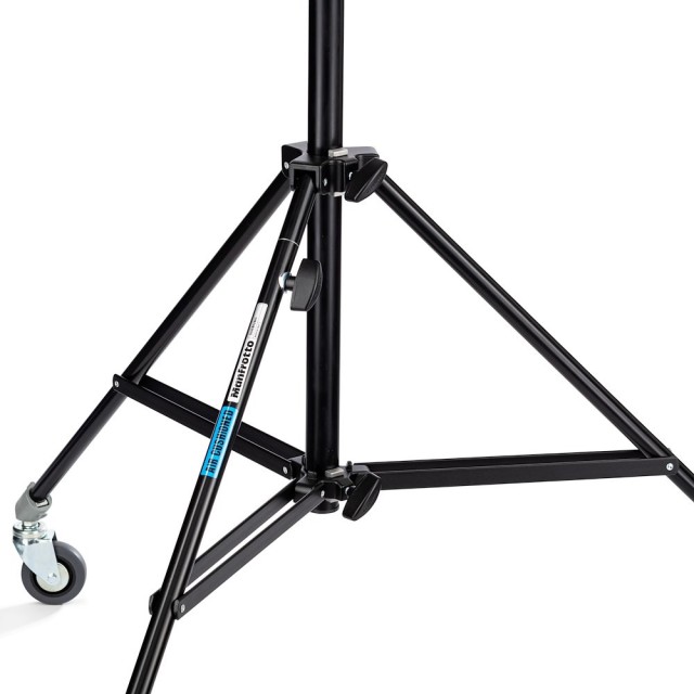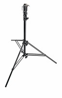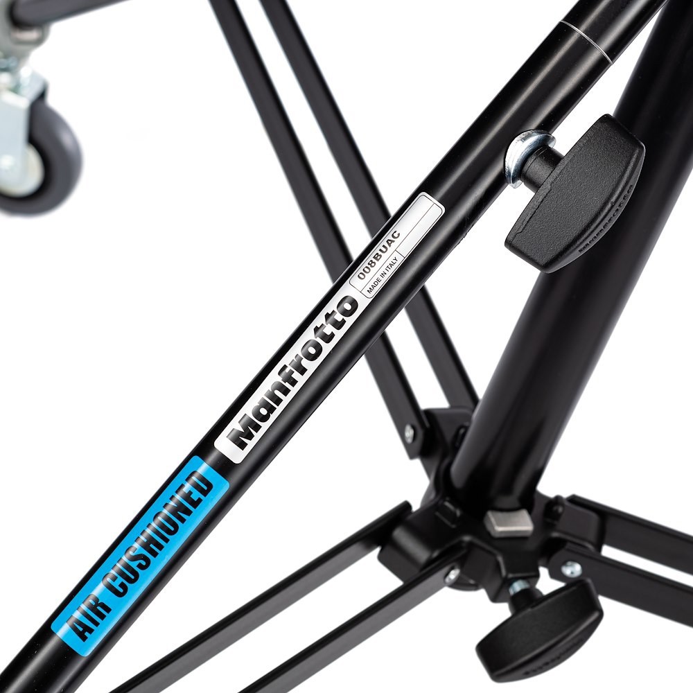 The Manfrotto 008BUAC is a black, 2-section aluminum air-cushioned stand with a leveling leg, supporting up to 15 kg and ideal for professional studio lighting. This stand combines lightweight portability with professional-grade strength and versatility, making it suitable for studio and location work alike.
