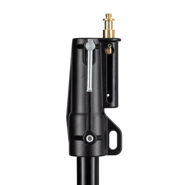 It includes a levelling leg, allowing stable use on uneven surfaces, including stairs or slopes. The stand supports a maximum payload of 15 kg and extends up to 212 cm, with a closed length of 112 cm for easy storage and transport. Its dual top attachment options—a 1 1/8" (28 mm) female receiver and a 5/8" (16 mm) male stud—ensure compatibility with a wide range of lighting heads and accessories.