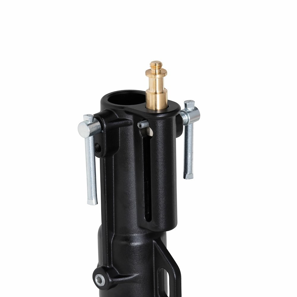 The Manfrotto 298B combines a wide black steel spider base (with three lockable wheels and one adjustable leveling leg) and three silver aluminum sections that extend smoothly to 300 cm via two risers. The rectangular steel legs fold flat for transport, while the leveling leg compensates for uneven floors up to ±15°. Topped with a removable 5/8" (16 mm) baby stud plus 3/8"-16 thread (1/4"-20 reducer available), it’s perfect for portrait studios, video sets, or rental kits needing a wheeled, stable stand that handles 15 kg close-in or 5 kg at full height—trusted durability for everyday professional use.