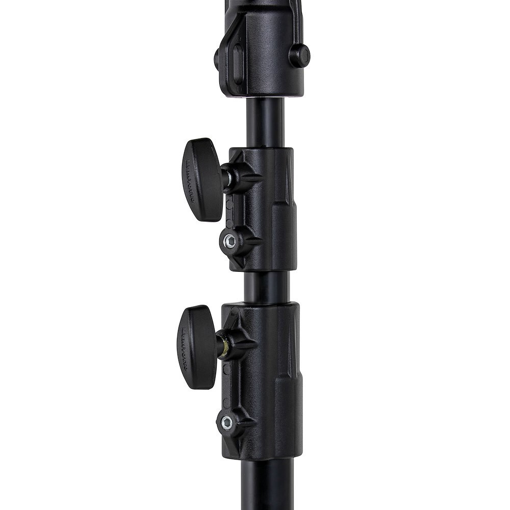The Manfrotto 298B Black Aluminium 3-Section Studio Stand is a 6 kg professional light stand with silver anodized aluminum columns (35/30/25 mm), black steel folding base on braked wheels, one leveling leg, and 15 kg payload (5 kg at full 300 cm extension)—delivering stable, mobile support for medium studio lights, softboxes, or overhead rigs.