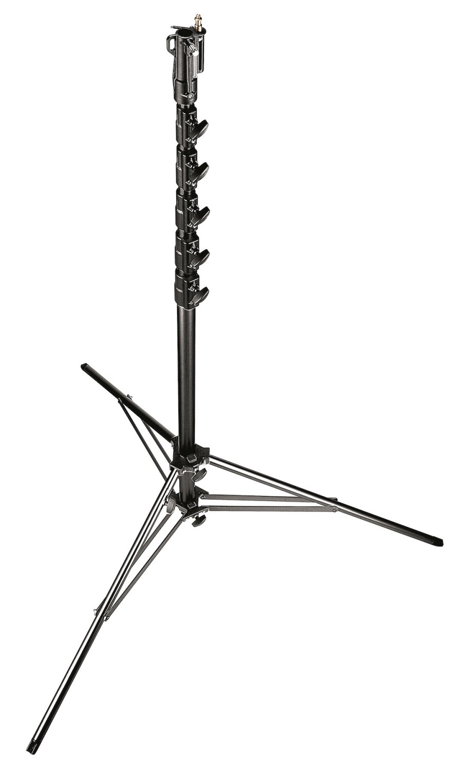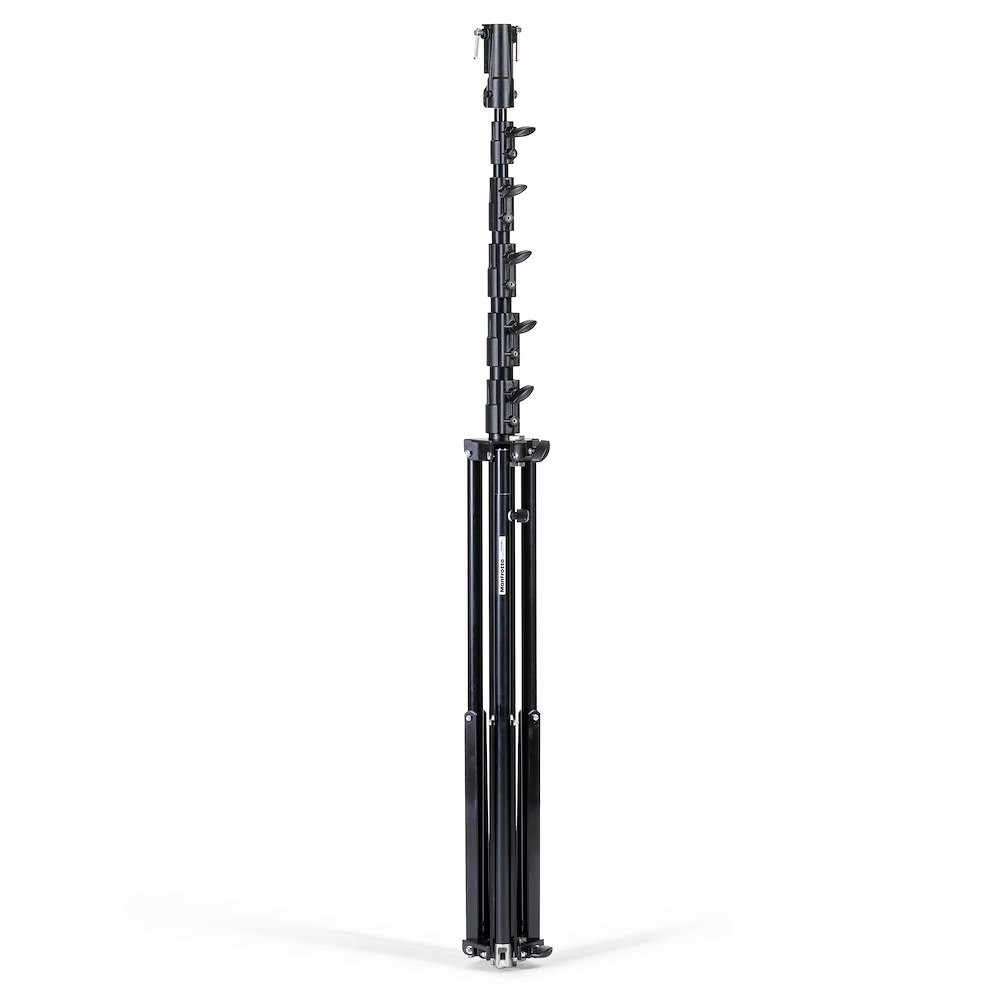 The Manfrotto 269HDBU Black Aluminum Super High Stand is the tallest production-ready light stand in the world: a rock-solid, double-braced 7.3 m (24 ft) black aluminum beast with 6 sections, 10 kg payload, one leveling leg and a universal type-14 head (28 mm socket + 16 mm stud + 3/8″ screw). Perfect for overhead frames, big softboxes, and high key/rim lights in large studios or on location when you need to go ridiculously high without renting a wind-up.