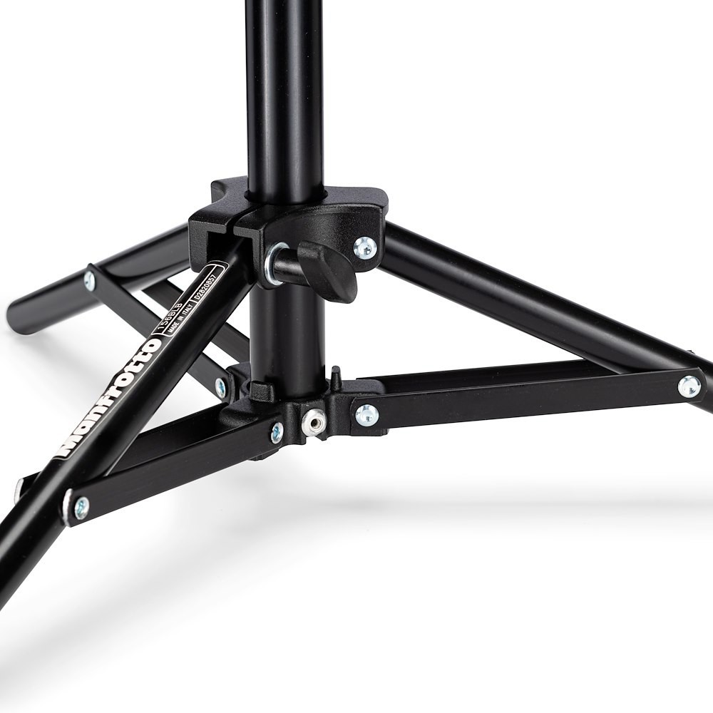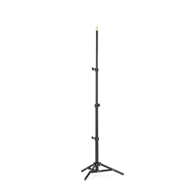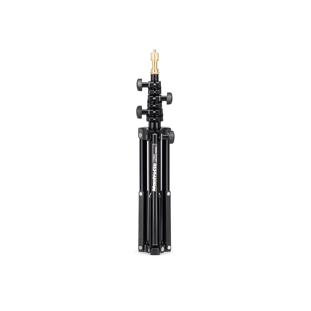 The Manfrotto 156BLB Black Aluminum Mini Pro Stand is a 620 g, 4-section (3-riser) ultra-compact tabletop stand that folds to 40 cm, extends to 123 cm, and supports 1.5 kg with a 5/8" (15.9 mm) baby stud + removable 1/4"-20 tip—delivering lightweight, rigid low-angle support for small lights, cameras, or modifiers in tight spaces.