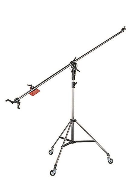 Easy to use and durable, the black Super Boom tripod is a smart accessory for professional photographers. Ideal for shooting in the studio and outdoor locations. Made of black aluminum, this tripod is portable and reliable. With a weight of 21kg, it supports a safe load of up to 5kg. With a sturdy design and legs with two reinforcements, you can be sure that your equipment is safe while shooting. For easy maneuverability and storage, the fixed base includes wheels that allow you to change the position of the stand in a snap. Also, with a leveling leg, you'll be able to use this stand on uneven terrain without a struggle. Made of three sturdy pieces, this stand quickly assembles and disassembles for better portability. Take with you and fold on the spot to save space. Featuring a 35mm diameter tube with 123 swivel clamp, 022 counterweight, Cine stand with casters and cable clips, you'll have everything you need to get the job done. This boom stand is ideal for a variety of uses.