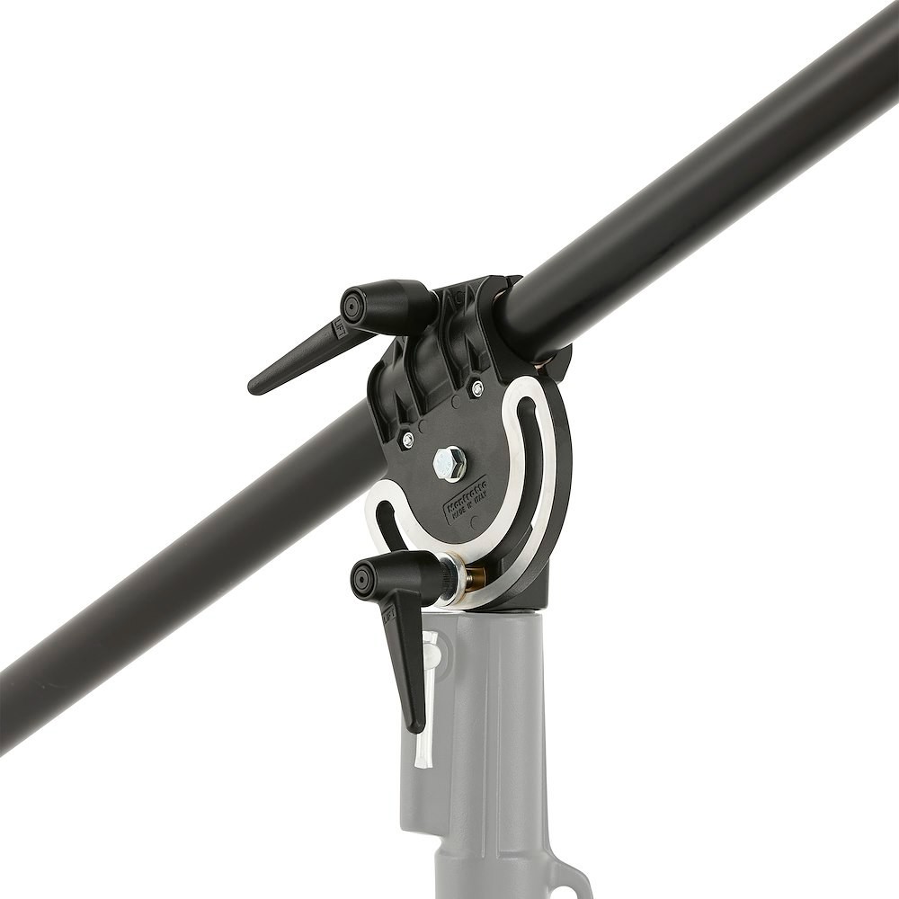 The Manfrotto Black Super Boom 025BSL is a professional one-section aluminum boom arm with a maximum extension of 2.7 m (8.8 ft), offering precise remote pan and tilt control via dual hand cranks. Finished in sleek black anodizing, it mounts directly onto Manfrotto Junior stands and includes a pivoting clamp, counterweight and cable clips for immediate use. Ideal for overhead lighting or heavy fixtures, it supports up to 5 kg even at full extension.