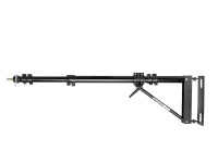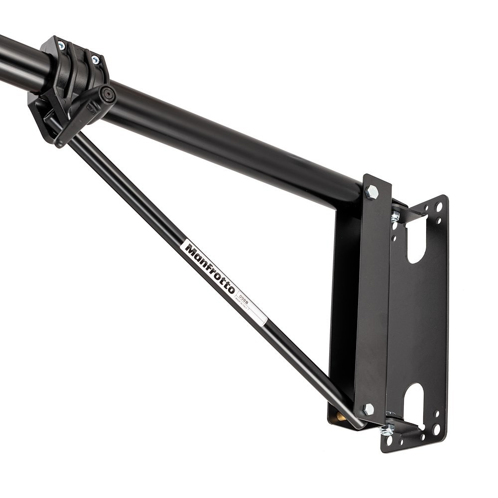 The Manfrotto 098B Black Wall Boom is a compact, wall-mounted 2-section aluminum boom arm (120–210 cm) that delivers 180° horizontal pan and 160° vertical tilt while supporting up to 4.5 kg at full extension. Perfect for small studios, interview corners, or permanent overhead lighting setups where floor space is limited – mounts directly to a wall stud or masonry with four screws (not included) and gives you a clean, cable-free overhead light or hair-light position.
