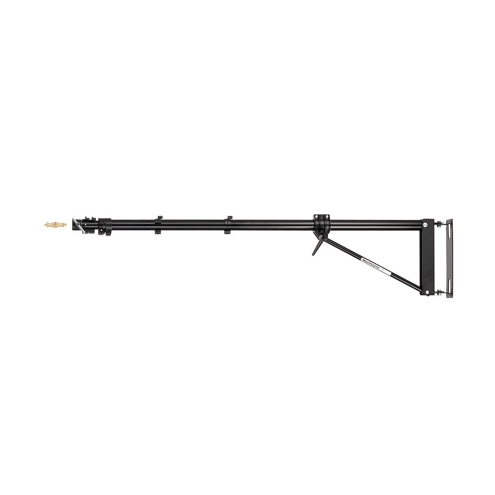 The Manfrotto 098B is the black version of Manfrotto’s classic space-saving wall boom. The two-section aluminum arm (35 mm + 29 mm tubes) telescopes from 120 cm to 210 cm and pivots smoothly on a heavy-duty wall plate with friction locks for both pan and tilt. A standard 5/8″ Baby spigot with 3/8″ thread is included on the end, and the boom can be locked at any angle. Ideal for permanent installation in portrait studios, YouTube sets, or makeup stations – once mounted, it folds flat against the wall and swings out only when needed, keeping the floor completely clear.