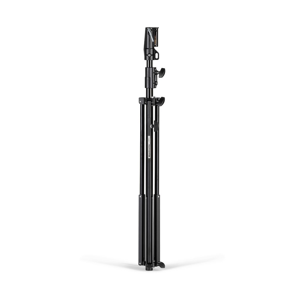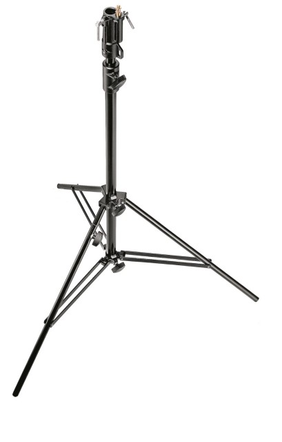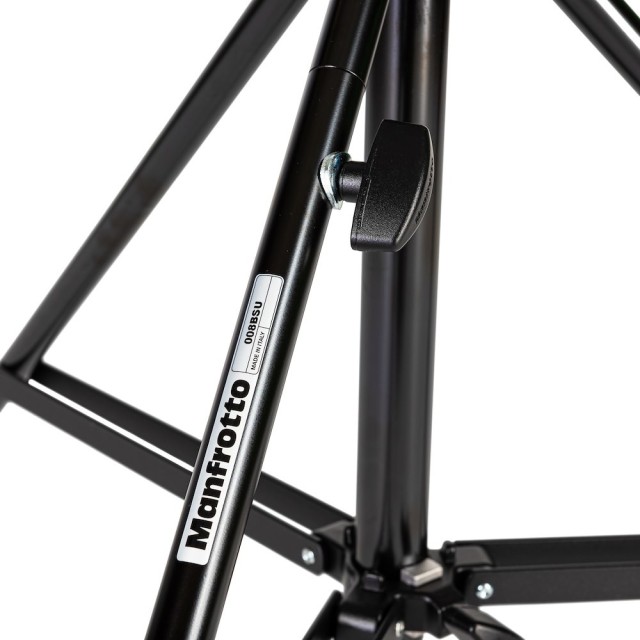 The Manfrotto 008BSU Black Zinc Steel Junior Stand is a 2-section, 1-riser heavy-duty stand extending 116–216 cm with 30 kg payload, double-braced legs, levelling leg, universal 28 mm socket + 16 mm stud head, and black zinc finish—delivering rock-solid stability for medium lights, modifiers, or booms in studio or location.