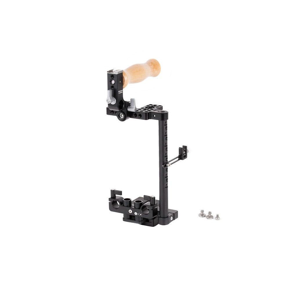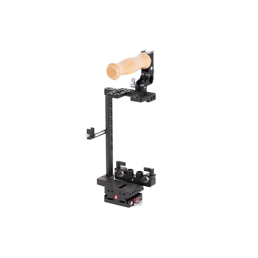Constructed from durable aluminum, this minimalist cage is lightweight yet robust, offering 1/4" and 3/8" mounting points on the top and sides for accessories such as microphones, monitors, and lights. It features a reversible top handle with an integrated cold shoe mount and a 15mm rod clamp to position follow focus units or matteboxes accurately. The handle can fold down for compact transport or mount vertically for a secondary grip.