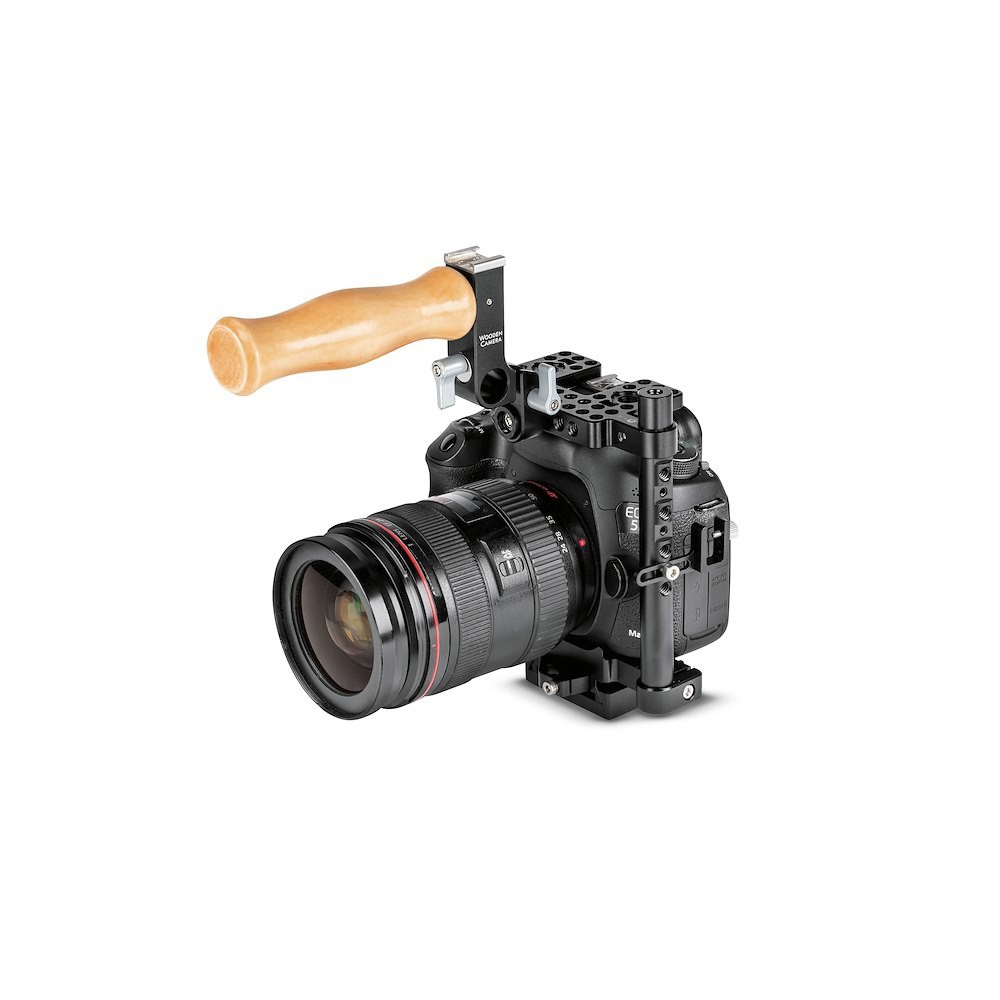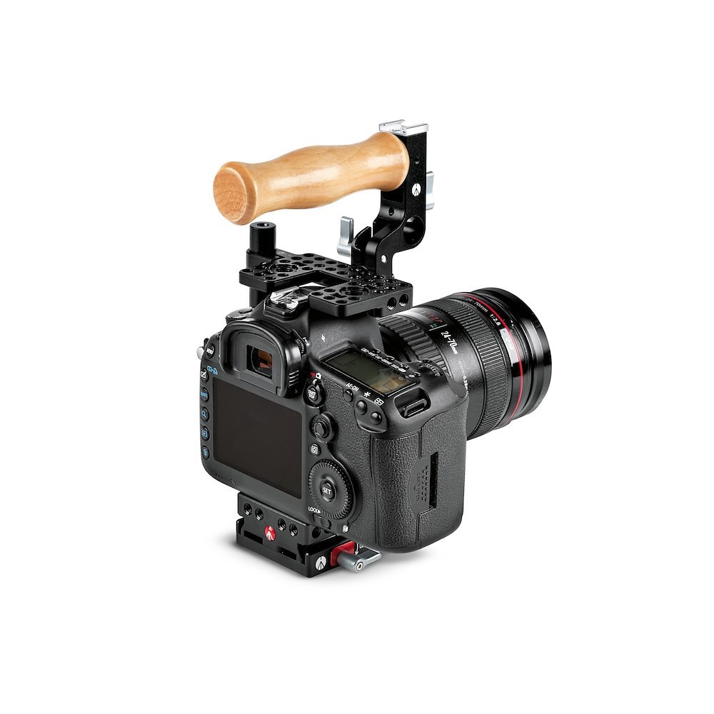 The MVCCM is Manfrotto’s pro-grade, minimalist cage for mid-size DSLR and mirrorless bodies up to 135 mm tall. Machined from black anodized aluminum, it locks securely around the camera with a quick-release baseplate and adjustable height riser so the cage clears battery grips and flip-out screens. A reversible top handle with integrated cold shoe and 15 mm rod port can be repositioned over the lens (for XLR adapters), folded flat for packing, or moved to the left-side vertical 15 mm rod as a secondary grip.