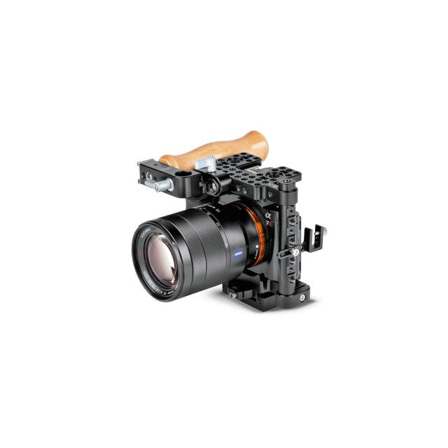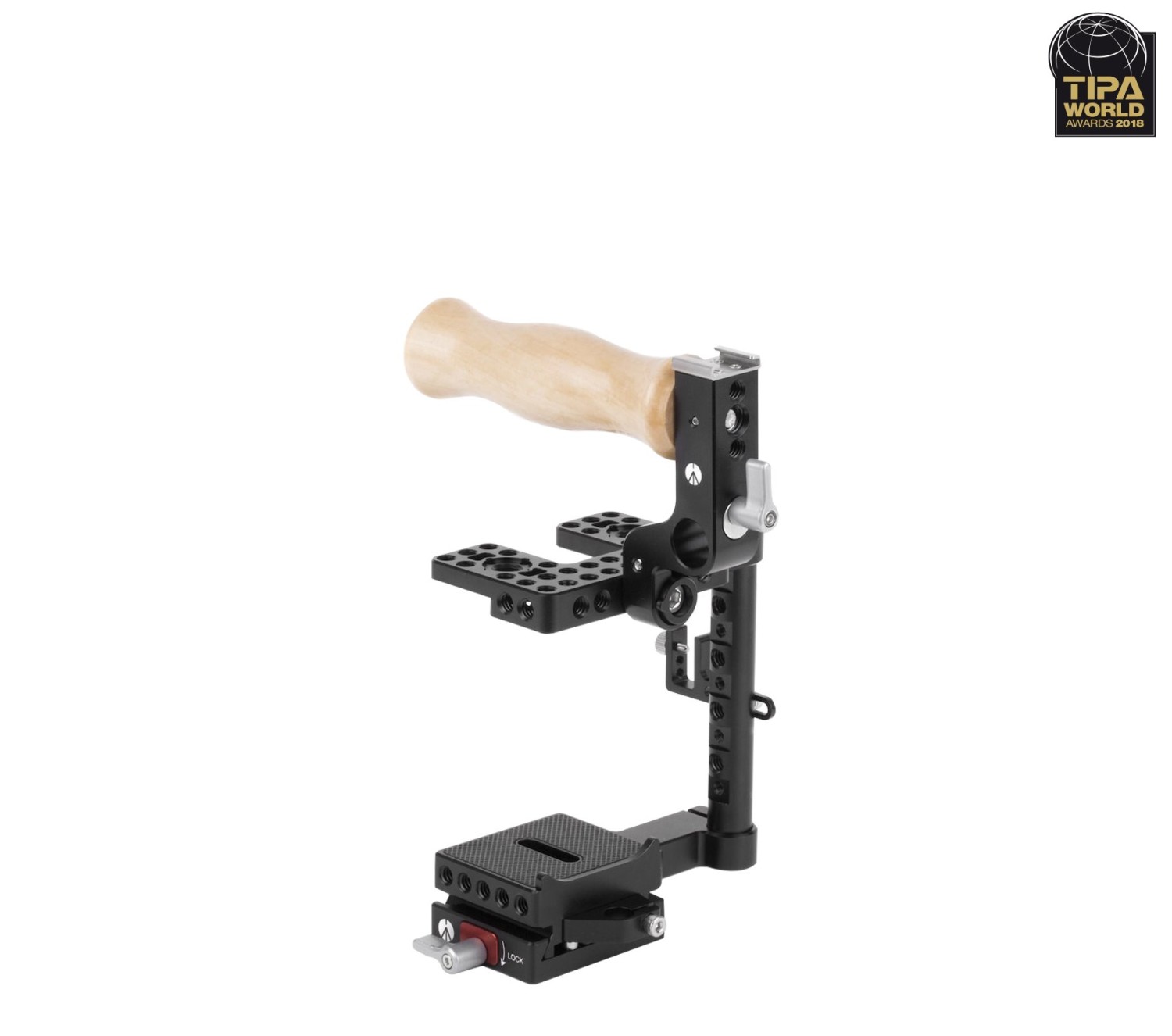 Camera Cage Small is designed for the Sony A7 series and Panasonic GH5 cameras, which utilize a top-mounted XLR audio module for sound recording.