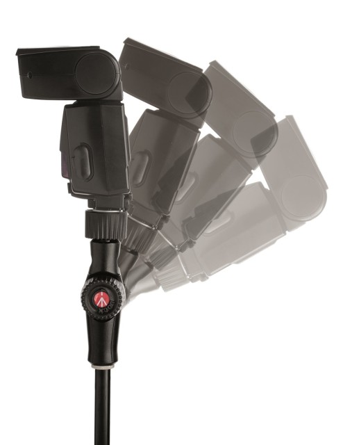 The Manfrotto MLH1HS-2 Cold Shoe Tilt Head is a 200 g aluminum tilt bracket with a cold shoe, umbrella socket, and 5/8" baby receiver—featuring a smart counterbalance ring and locking knob to securely angle flashes or small LEDs up to 2 kg on any light stand.