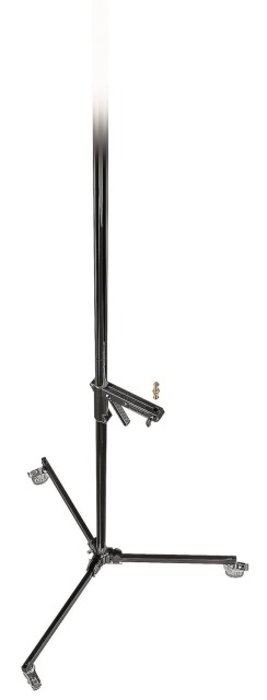 The Manfrotto 231B Black Column Light Stand is a professional single-column studio stand with lockable wheels, a removable rolling base, and a spring-loaded sliding arm that glides smoothly from 35 cm to 250 cm, supporting up to 8 kg total (2 kg at full extension) and multiple lights via universal 1/4″ and 3/8″ top fittings – perfect for fast, precise studio positioning and easy transport.