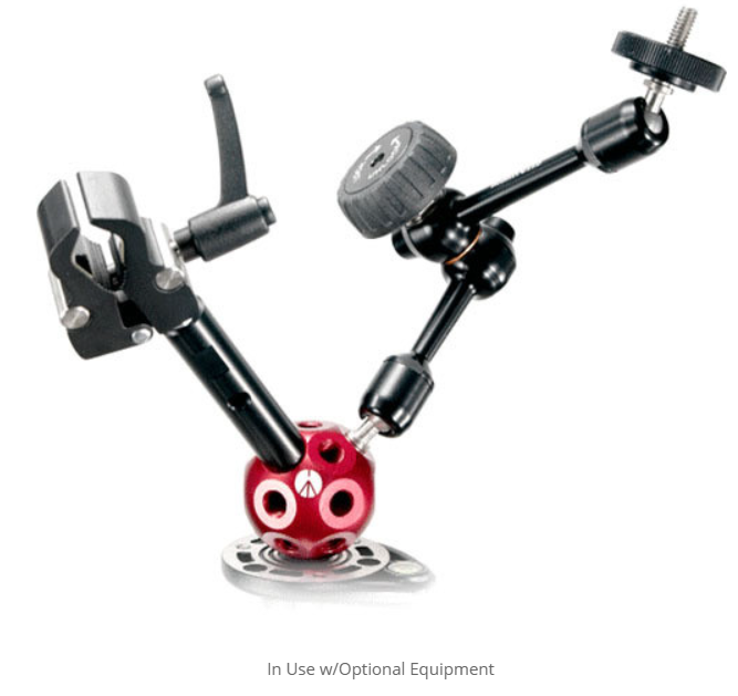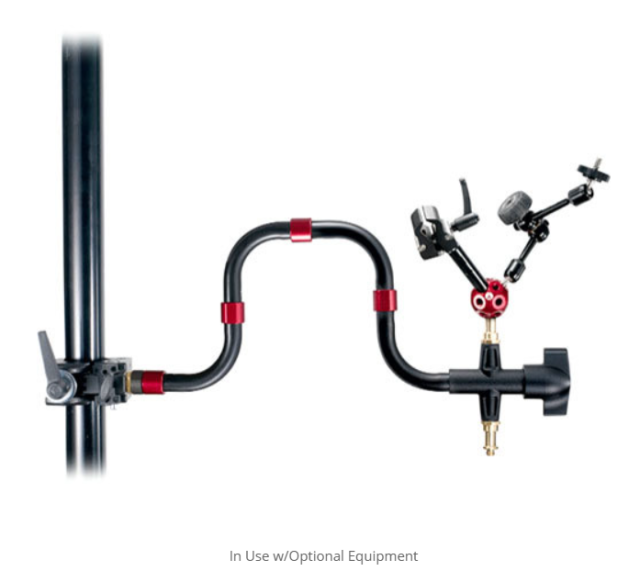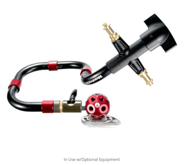 The Manfrotto Dado Kit creates a 360° multi-arm hub from a single stand or Super Clamp. The red aluminum sphere features six 3/8"-16 female sockets arranged in a precise geometric pattern, accepting the included six black 3" (7.6 cm) rods—each with 3/8"-16 female threads on both ends. Stack additional Dado rods, Magic Arms, or spigots to mount LEDs, lav mics, gobos, or reflectors in any orientation.