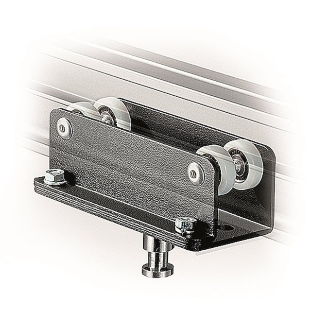 The Manfrotto FF3228 Dismountable Carriage Black is a free-sliding, insertable sky-track trolley that can be added at any point on an already-installed Manfrotto fixed rail (FF3208/FF3214) without disassembling the system. Simply unscrew the wheel plate, drop it in, and reattach — perfect for expanding an existing overhead lighting setup in professional studios.