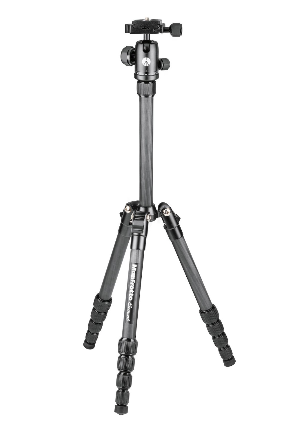 The Manfrotto MKELES5CF-BH Element Traveller Small Tripod with Ball Head is an ultra-portable 1.05 kg travel kit that folds to 32 cm, extends to 143 cm and supports 6 kg CSC payloads with a smooth aluminum Arca-type ball head, independent 360° pan lock, twist-lock legs, three leg angles, and a telescopic center column—complete with padded carry bag.
