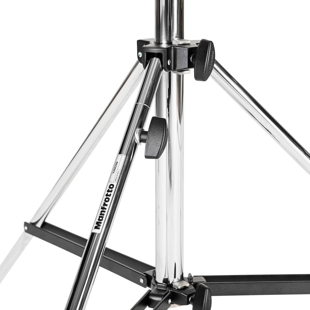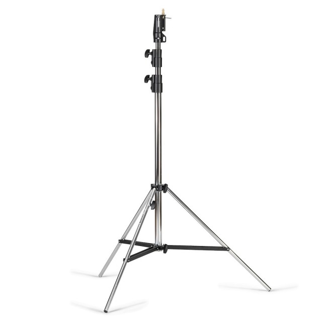 The Manfrotto 126CSU (black chrome finish) is one of the strongest air-cushionless steel stands in the Manfrotto/Avenger range. Built entirely from chrome-plated steel with double-braced leg bracing and a wide 131 cm footprint, it delivers exceptional stability even at full 333 cm height. The standout feature is its 40 kg maximum payload (3 kg at full extension) combined with a built-in levelling leg that keeps the stand perfectly vertical on uneven terrain. The universal head type 14 offers a 28 mm Junior female receiver, 16 mm baby stud, and 3/8" thread, making it compatible with virtually all professional lighting fixtures. Optional 109/110/110G wheel sets can be added for easy studio mobility.