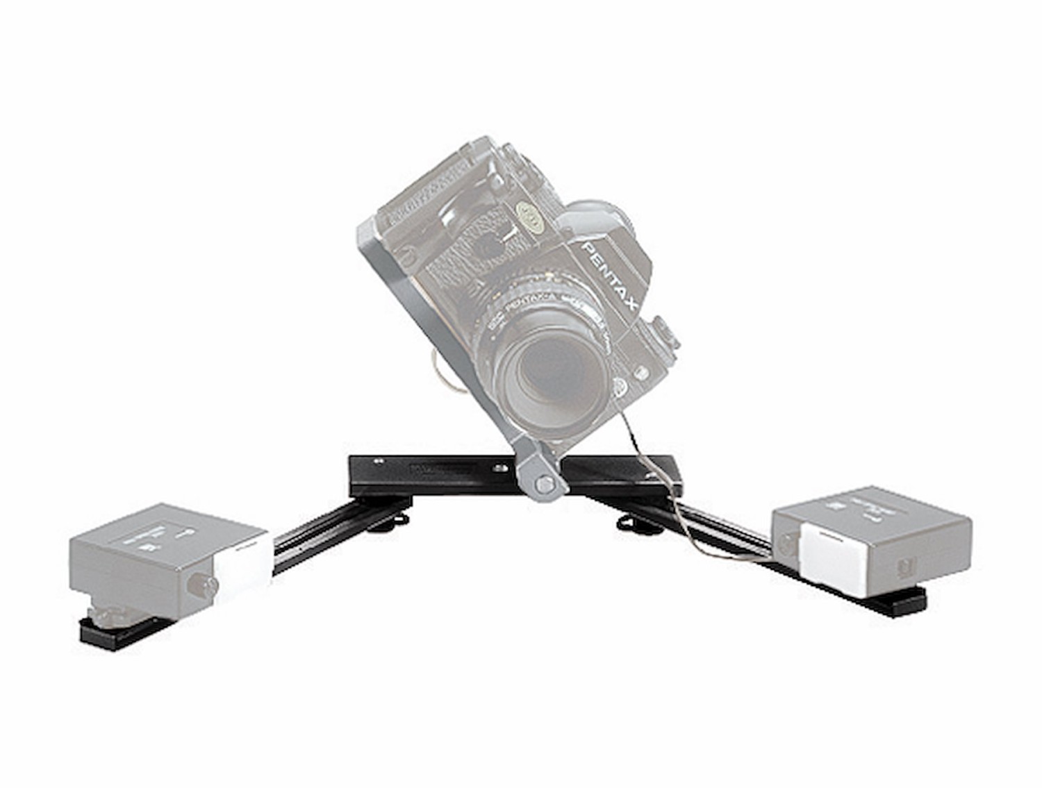 The Manfrotto 330B Macro Bracket Support enables mounting of two flash heads alongside a camera on a tripod head, offering versatile lighting options for macro photography.