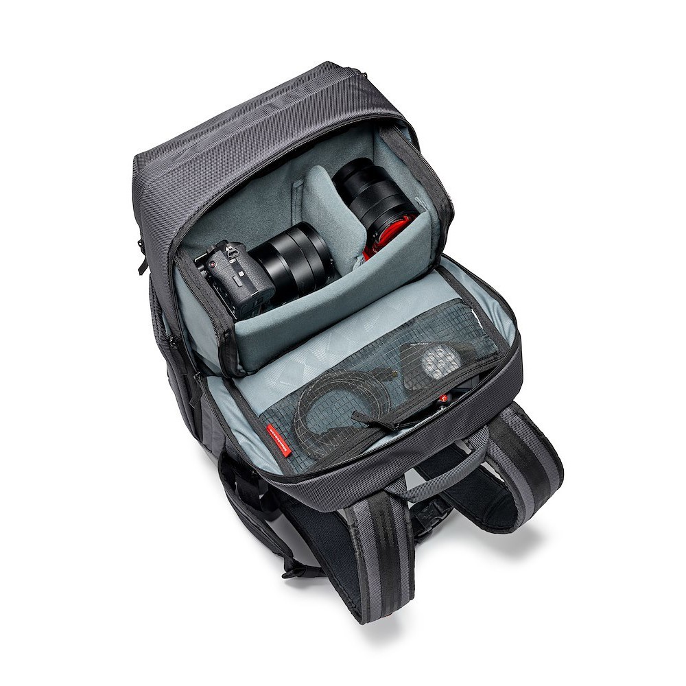 The Manfrotto Manhattan Mover-50 Camera Backpack is designed for photographers who need reliable protection and mobility in urban environments. Its internal removable insert with the innovative Flexy Camera Shell system allows full customization, safely holding a DSLR with a 70-200/2.8 lens attached, up to four additional lenses, a flash, or a premium mirrorless camera like a Sony A7 or Fujifilm XT series with an extra lens. Secure top and back access provide flexibility when retrieving gear.