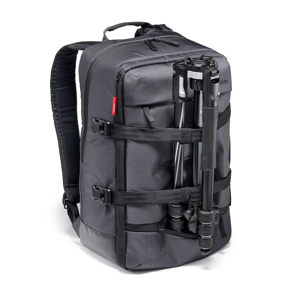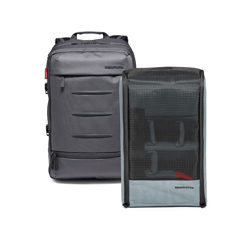 The Manfrotto Manhattan Mover-30 (MB MN-BP-MV-30) is a sleek, urban gray camera backpack that holds a premium full-frame CSC (e.g., Sony A9 + 70-200/4 attached) plus 3–4 extra lenses in the lower Flexy Camera Shell compartment, while the top section accommodates a second CSC body or a folded DJI Mavic Pro + batteries. The fully removable padded insert converts it in seconds into a minimalist everyday laptop/daypack, and the clever NeverLose front system carries a tripod, skateboard, or jacket—making it the perfect hybrid bag for city photographers who commute, shoot street, and travel light.
