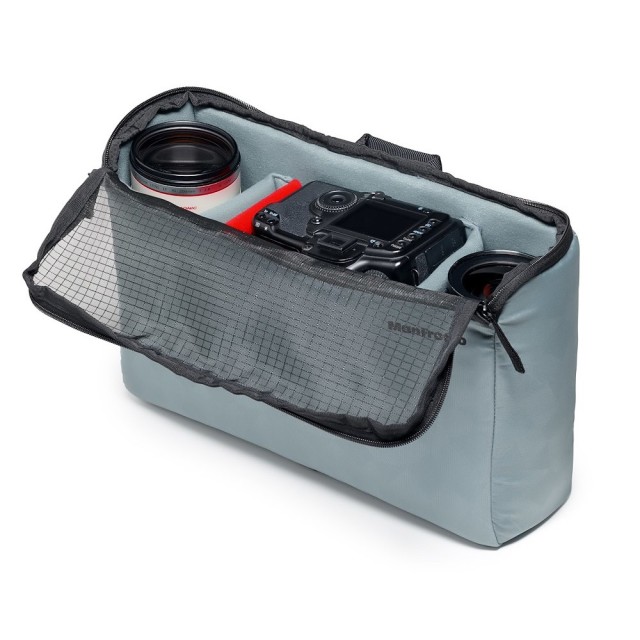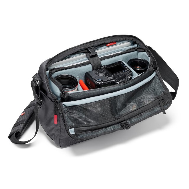 The Manfrotto Manhattan Speedy-30 is a premium messenger bag that seamlessly blends everyday style with serious gear protection. Its fully removable padded insert with innovative red Flexy dividers holds a medium-level DSLR or mirrorless body with standard zoom attached plus up to 5 lenses (including a 70-200mm f/2.8), while the dedicated rear compartment safely carries a 14″ laptop and 9.7″ tablet. When you don’t need camera gear, simply pull out the insert and use it as a sleek everyday or work bag.