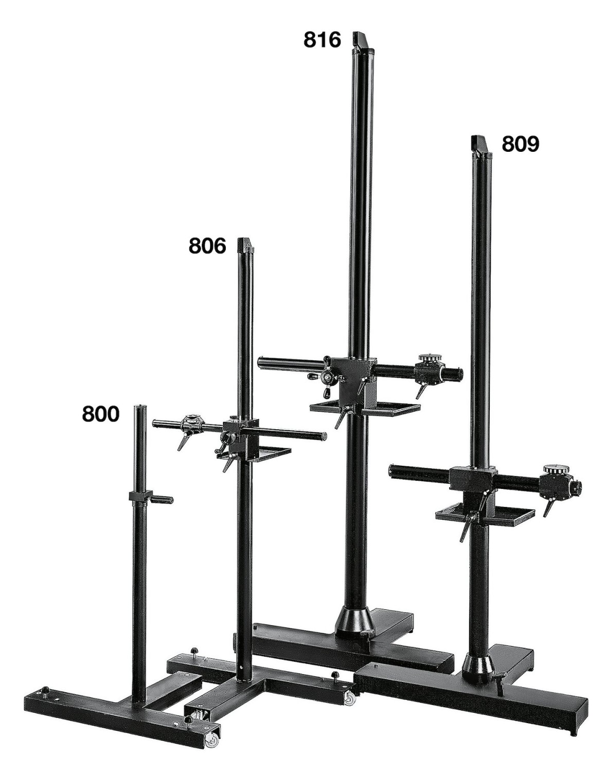 The balanced column made of black anodized aluminum is mounted on a heavy cast iron base measuring 84 x 55 cm with two swivel wheels that lock securely with individual wheel locks.