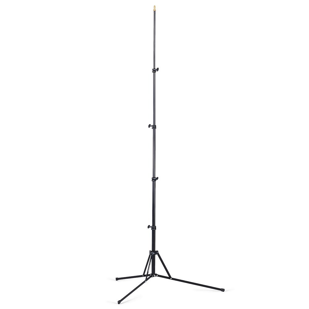 The Manfrotto 5001B-1 Nano Lighting Stand is a 960 g black aluminum 5-section (4-riser) compact stand that folds to 49 cm, extends to 190 cm, and supports 1.5 kg with reverse-folding rectangular legs, 5/8" (16 mm) baby stud + removable 3/8" or 1/4" thread adapter—delivering ultra-portable, carry-on-ready support for small LED lights, flashes, or…