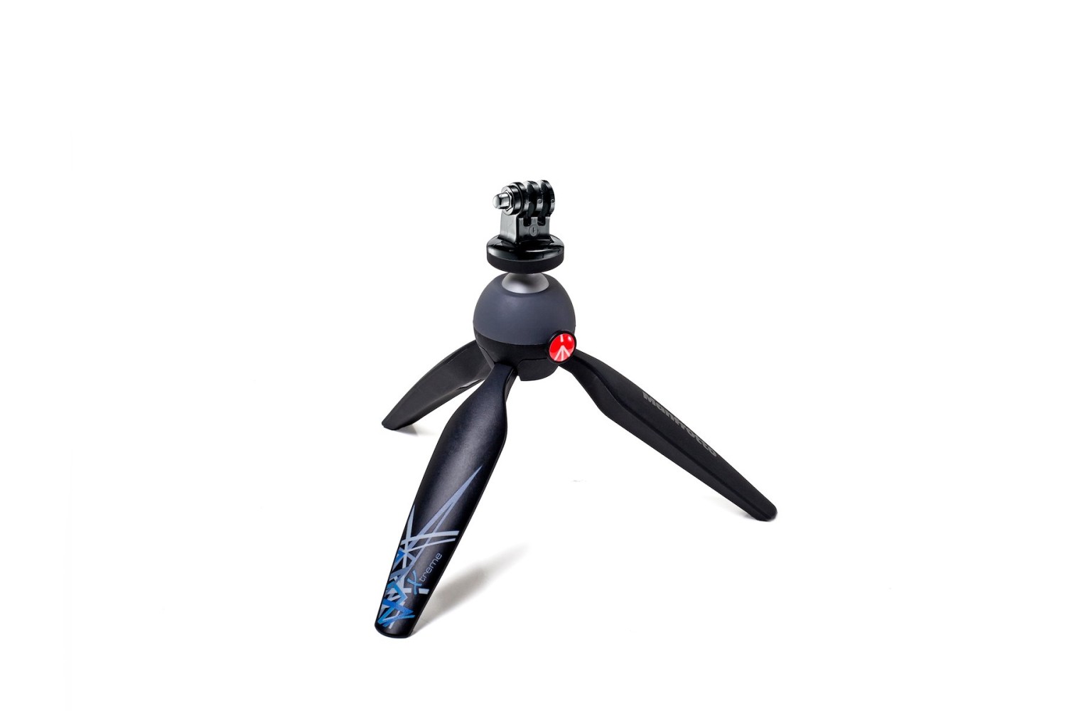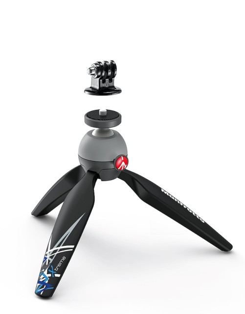 Manfrotto PIXI Xtreme Mini Tripod with GoPro Adapter: Ultra-portable 6.3" tabletop/grip tripod with push-button ball head, 1/4"-20 screw, rubber feet, and dedicated GoPro mount—supports 2.2 lb in a 6.9 oz stainless steel/Adapto package.