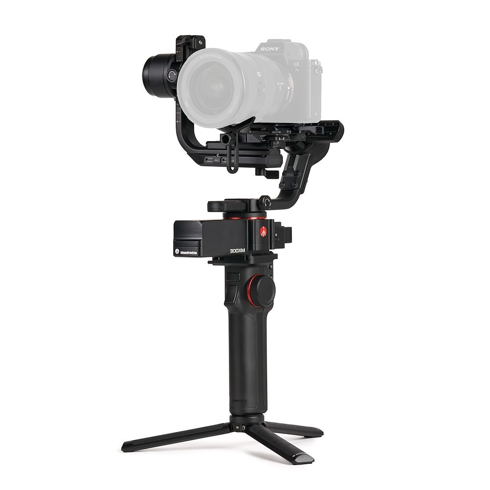 Balancing is simplified with memory red dots on both vertical and cross arms, and independent axis locks prevent shaking during transport. The MVG300XM supports a variety of shooting modes, including Timelapse, Inception, Panorama, Portrait, and Selfie. A removable rear handle ensures stable support at different angles and a mini tripod allows quick setup and balancing. The dedicated Manfrotto Gimbal 300XM App enables remote control and advanced functionality via Wi-Fi.