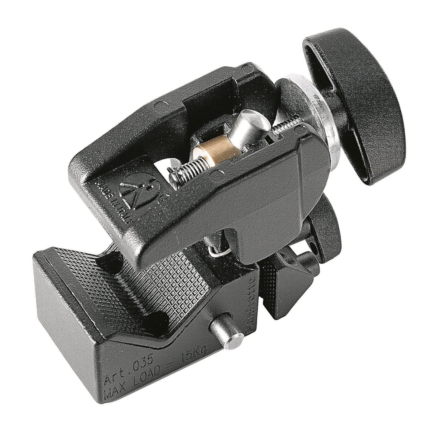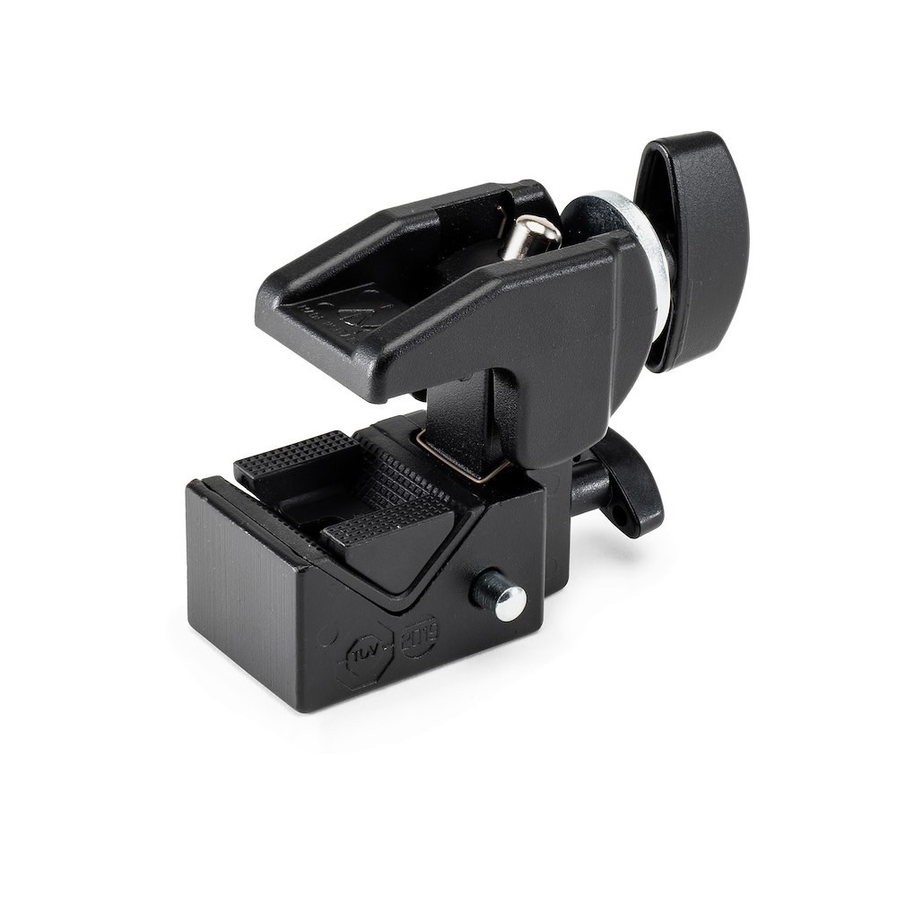 The Manfrotto Quick Action Super Clamp is an intuitive, Italian-designed mounting powerhouse (0.488 kg) that securely grips tubes or plates from 13–55 mm with a rapid-locking jaw and included flat-surface wedge, supporting up to 15 kg via a 5/8" (16mm) Baby socket; perfect for studio or location use, it functions as a clamp, stand, or creative extension—mounting cameras, lights, hooks, or additional clamps to tripods, poles, doors, or beams with unrivaled speed, versatility, and TUV-certified durability.