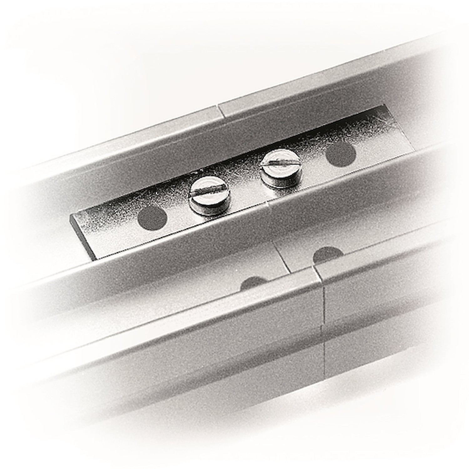 The Manfrotto FF3208 Rail Connector is an 84 g pair of aluminum clamp plates with screws that joins two Sky Track fixed rails end-to-end on the upper guide via pre-drilled holes—requiring a supporting rail-mounting bracket astride the junction for safe, professional studio ceiling track continuity.